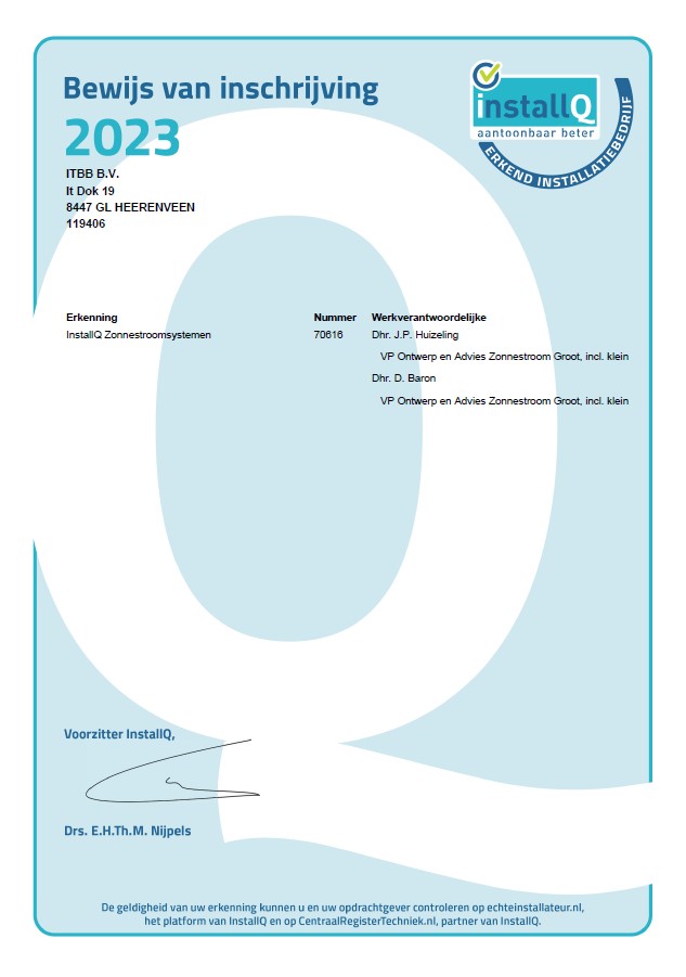InstallQ Bewijs inschrijving 2023 Zonnestroom
